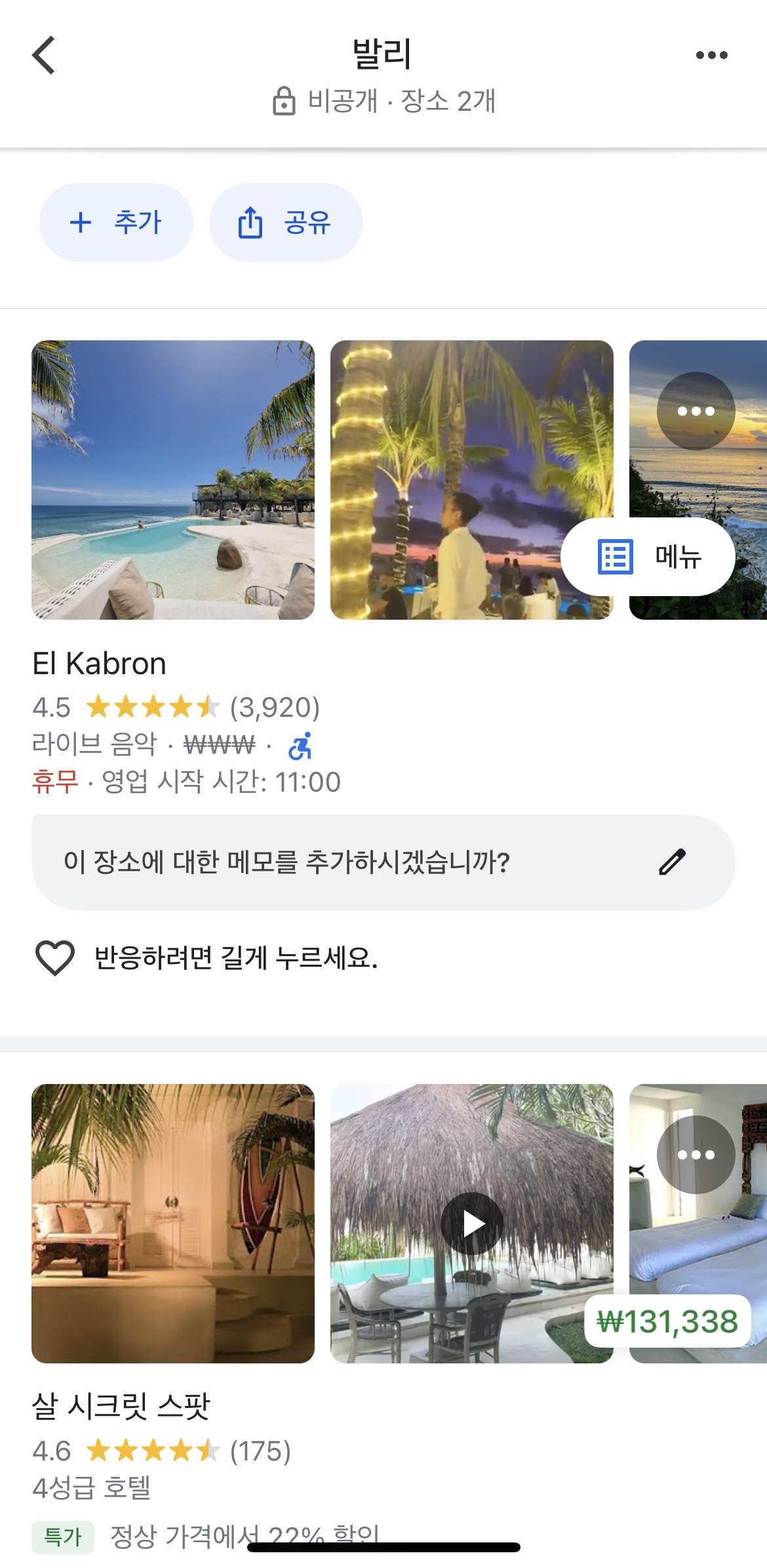당장 갈 계획은 없지만 구글맵에 저장해 놓고 책장을 덮었다. 이십대에 갔었던 발리는 내 기대와 달랐는데 그때는 자카르타에서 봉사활동을 하고 갑자기 갔던 거라 그랬으리라 생각하고,, 언젠가 또 가보길 소망한다 :)